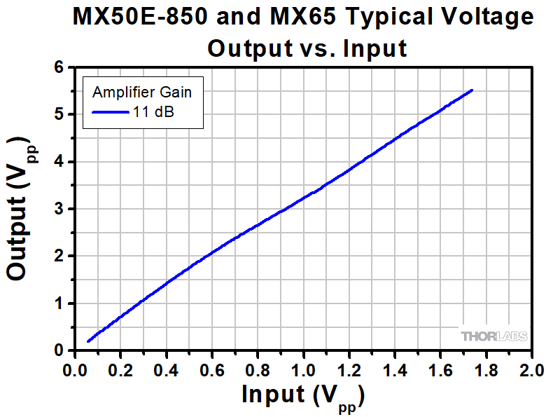 Figure 2.4 リニア増幅器では入力電圧と出力電圧間が線形(リニア)な関係となります。MX50E-850およびMX65シリーズトランスミッタのゲイン定数は11 dBです(調整不可)。