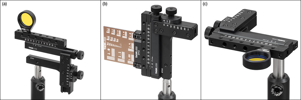 Figure 1.3 アダプタXYA1/Mは、フィルタやレンズ用の固定式マウントと組み合わせると、テストターゲットやダイクロイックビームスプリッタなどの光学素子の取付けと位置合わせができます。一方の移動軸を垂直方向に向けることも、両方の移動軸を水平方向に向けることもできます。