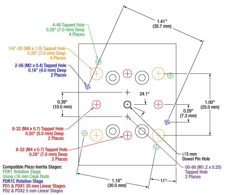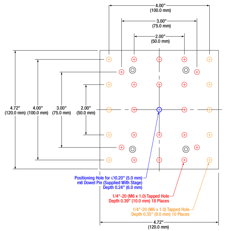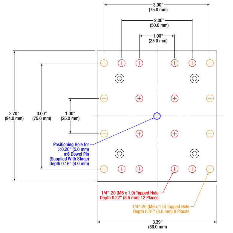 The GNM1(/M) stage provides an array of mounting holes for compatibility with ORIC piezo inertia rotation and translation (5 mm and 20 mm) stages as well as general optomech, while the larger GNM2(/M) and GNM3(/M) stages provide arrays of 1/4"-20 (M6 x 1.0) mounting holes for mounting general optomechancial components and many of our other stages; click Figures 1.1, 1.2, and 1.3 for details. The base of each stage features either three or four 1/4" (M6) mounting bores that are compatible with imperial or metric hole patterns. Dowel pin holes on the moving platform and base of each stage enable precise positioning using the included dowel pins.