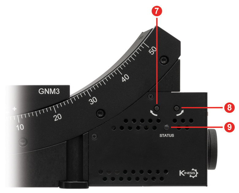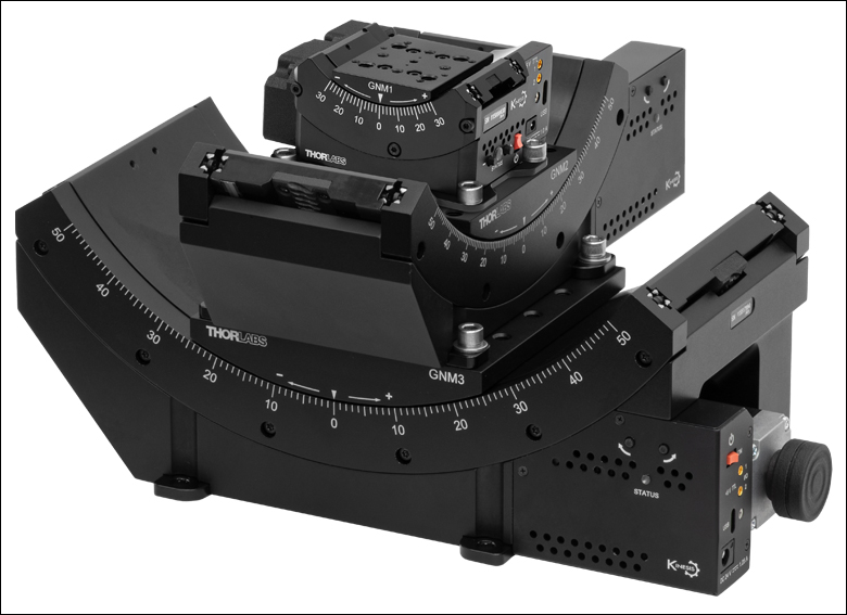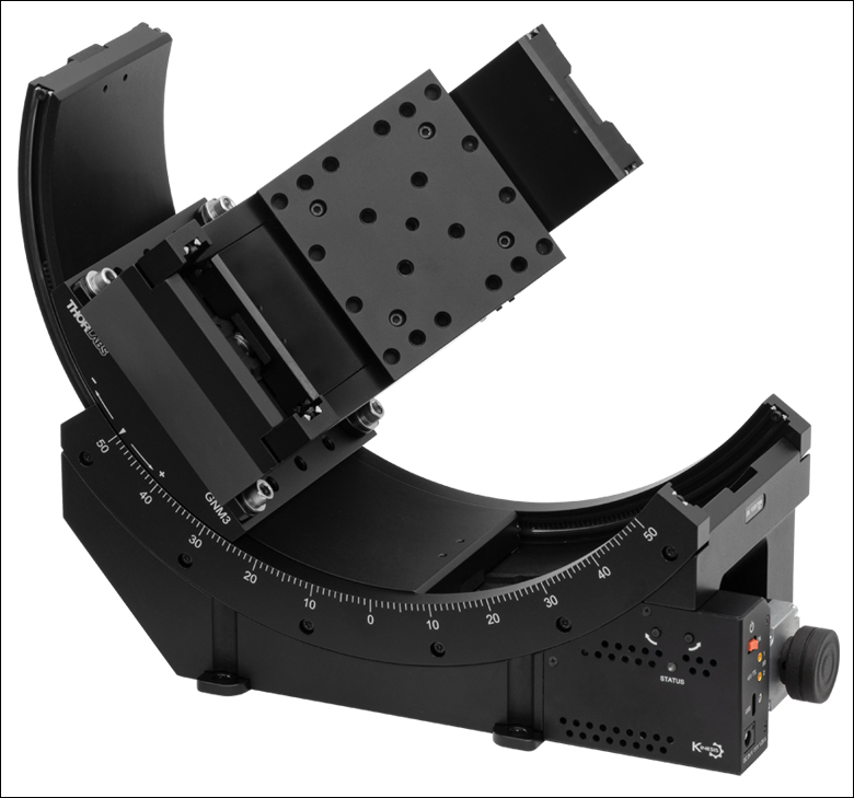 The GNMx(/M) series of motorized goniometers offer unobstructed, pure rotational motion about their virtual axes of rotation. They each feature an integrated microstepping motor, optical encoder, and controller designed for remote operation, as well as jog buttons on the side for manual actuation. Input and output triggers enable external triggering using 5 V TTL signals.