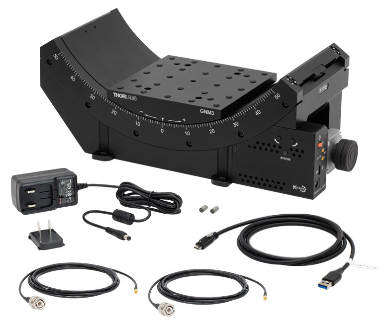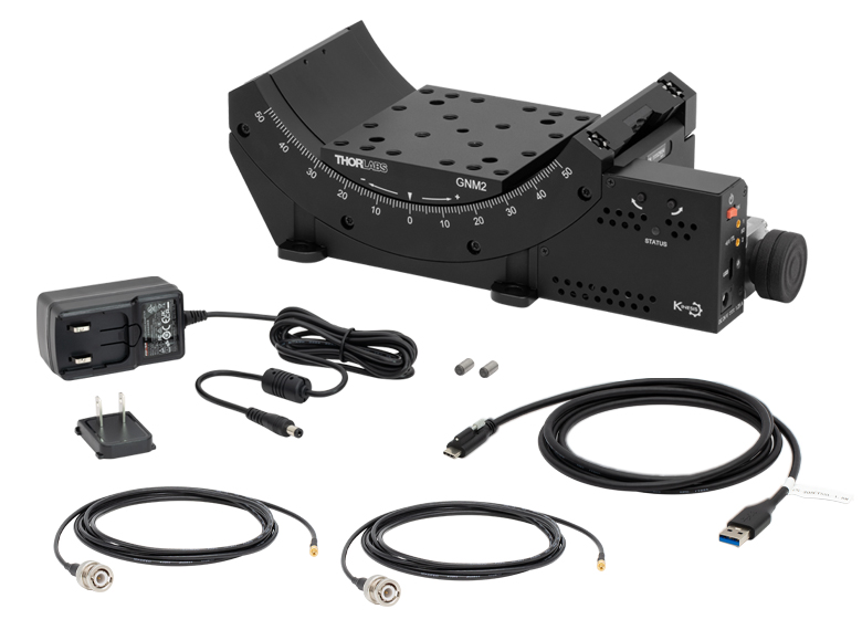 These stages are compatible with our Kinesis software package, which can be downloaded here. Please see the Kinesis Software tab for more information. A CABCUL72 locking USB Type-C cable is included for remote connections, as well as two CA3272 MMCX-to-BNC input and output trigger cables, and a KPS201 15 VDC power supply (Item # GNM1(/M)) or 24 VDC power supply (Item #s GNM2(/M) and GNM3(/M)). CA3439 MMCX-to-SMA cables are available separately.