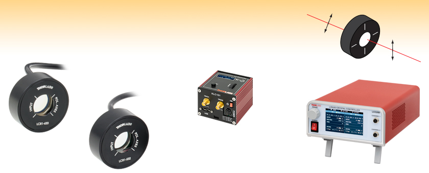 開口Ø10 mmの液晶(LC)偏光ローテータをご用意しています。対応する波長は532 nmおよび633 nmです。入射光の偏光軸はローテータ筐体の前面に刻印されている線に合わせてください。ローテータには長さ約930 mmのBNCケーブルが付いており、LCC25やLCC25D、KLC101(下記参照)などのドライバに接続できます。リターダの外径は25.4 mm(1インチ)で、ポスト取付け用回転マウントRSP1/Mや30 mmケージシステム用回転マウントCRM1PT/Mのような、厚さ9.4 mmの光学素子に対応したØ25 mm~Ø25.4 mm(Ø1インチ)光学マウントに取り付け可能です。