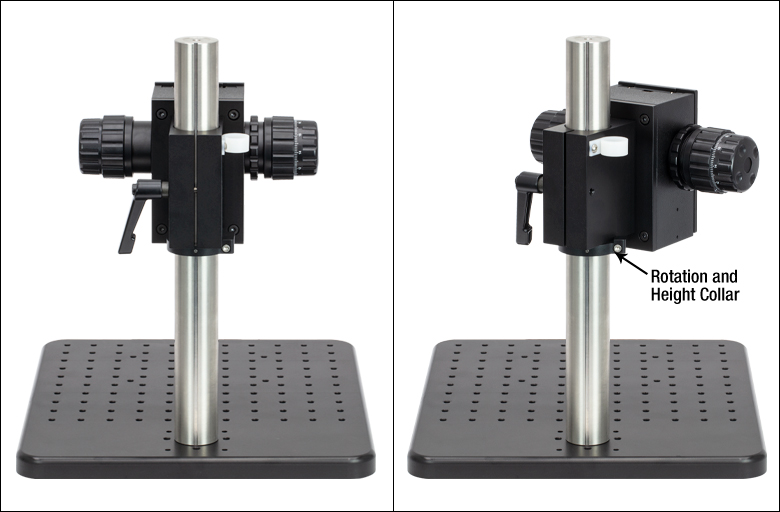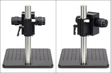 血管造影のような振動に敏感な研究に適した、高剛性または調整機能付きスキャナを取り付けしやすいスタンドです。ポストに取付け済みの集光ブロックは、ノブでZ軸粗動(40 mm/回転)および微動(225 µm/回転)調整が可能です。 集光ブロックの下にある回転および高さ調整カラーにより45°回転し、スキャナーヘッドを試料から離して調整を行うことができます。