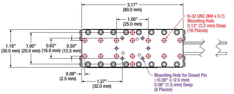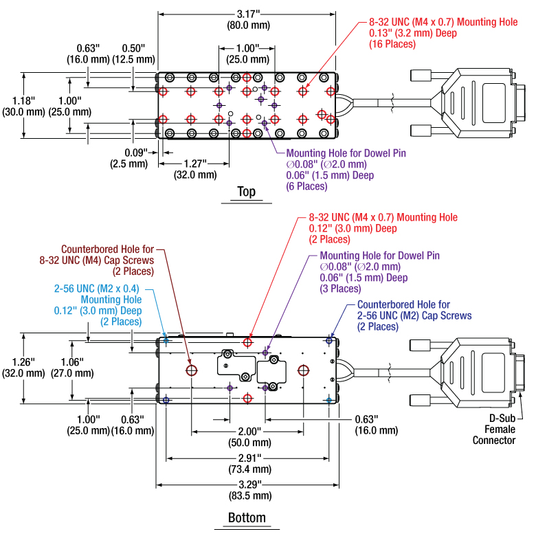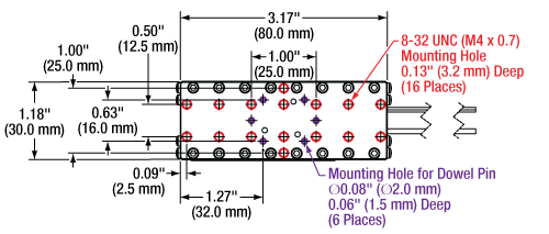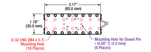 | Top Plate Mounting Options | Sixteen 8-32 (M4 x 0.7) Threaded Holes, 3.2 mm Deep Six Ø2 mm Dowel Pin Holes, 1.5 mm Deep PD3T(/M) Adapter | |