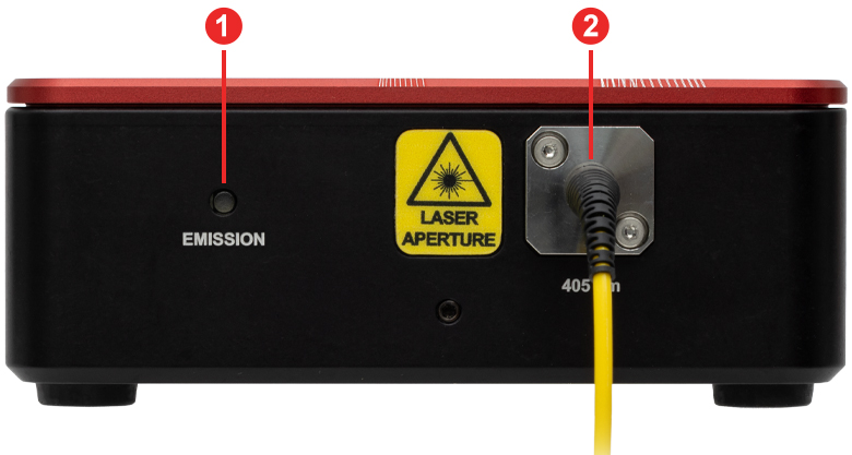 前面パネルのLEDの2色(赤/青)は、レーザ出力が可能なことを示し、多くのレーザ保護メガネで視認できるよう設計されています。