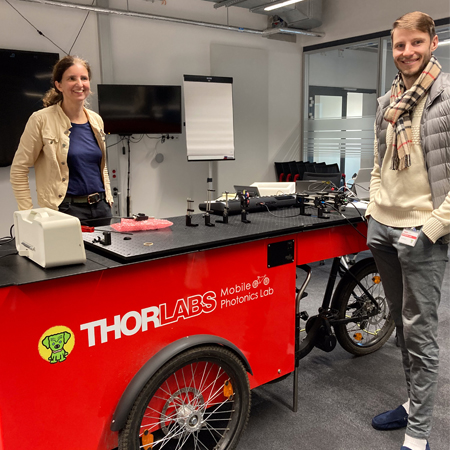 Meanwhile, our efforts are extending internationally as we adapt this model to serve students in Europe. The introduction of a mobile lab on three eco-friendly wheels aligns with our commitment to sustainability, ensuring minimal environmental impact as we continue to share photonics education. In Europe, where space is often limited on university campuses, our mobile lab's compact design is well-suited. This mobile lab is easily maneuverable and akin to a friendly arrival on a bike, carrying the equipment and people needed to facilitate learning experiences.