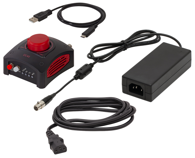 LEDドライバDC40には、15.0 VDCの電源と電源ケーブル、およびUSB 2.0 Type-A - Type-Cケーブルが付属しています。 このドライバに付属するアイテムの一覧は「発送品リスト」タブでご覧いただけます。