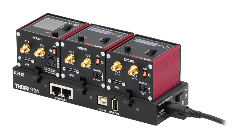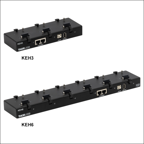 コントローラーハブKEH3またはKEH6 はスリムなベースプレート型の架台で、上面には電気接続用のコネクタが付いています。このコントローラーハブは、内蔵されているUSB 2.0規格のUSBハブ回路により全ての通信を行うことができ、また最大3台(KEH3)か6台(KEH6)までのK-Cubeへの電源供給を電源ケーブル1本で行うことができます。コントローラーハブには2つのイーサネット接続ポートが付いています。2つ目のイーサネットポートまたはUSB OUTポートを別のコントローラーハブの入力ポートに接続すると、ホストPCからの1本のイーサネットまたはUSBケーブルだけで、PCと複数のコントローラーハブとの接続が可能になります。