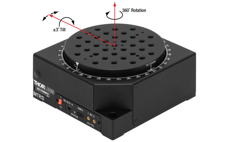 With both rotation and tilt control (Figure 1.1), the MTRS(/M) stage is useful for applications such as imaging surface imperfections. The stage is also suitable for use with laser sources, fiber optics, and other multi-axis stages.