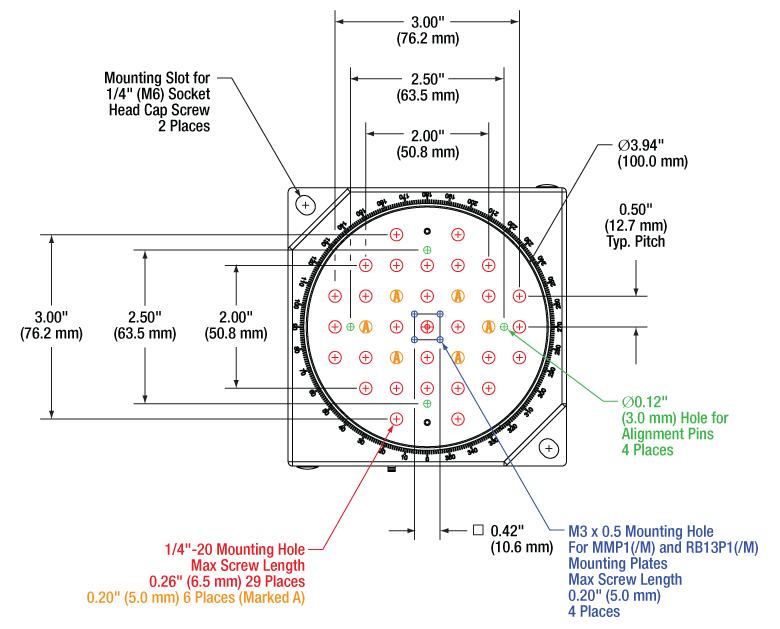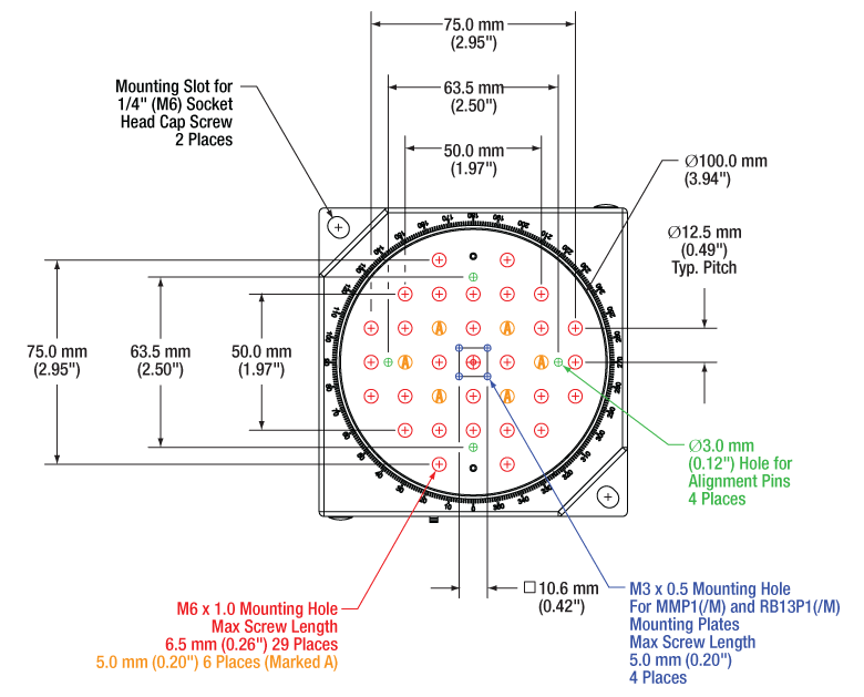 With a 115 mm x 115 mm footprint and an array of tapped holes (Figures 1.2 and 1.3), the MTRS(/M) stage is compatible with Thorlabs' ORIC® Piezo Inertia Rotation and Translation (5 mm and 20 mm) Stages, the KVS30 Motorized Vertical Translation Stage, or the M30XY Motorized XY Translation Stage, as well as general optomechanical components. By combining stages, up to 5-axis adjustment can be achieved. To change the nominal starting angle from 0°, adapters such as the AP30 angled mounting plate or the AP180 adjustable angle mounting plate can be secured to the platform. For applications that might require long linear travel + rotation and tilt control, the MTRS(/M) can also be mounted on the DDS300(/M) or DDS600(/M) direct drive stages, among others.