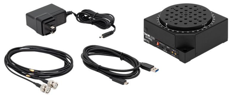 These stages are compatible with our Kinesis software package, which can be downloaded here. Please see the Kinesis Software tab for more information. Each stage includes a 79" (2 m) USB A to USB C cable for remote connections, two 72" (1.8 m) MMCX-to-BNC input and output trigger cables, and a 15 V, 2.4 A power supply. CA3439 MMCX to SMA cables are available separately.