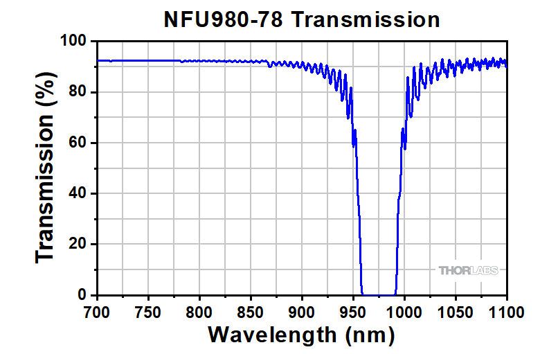 Thorlabs offers Ultra-Thin Notch Filters, also commonly referred to as band-stop or band-rejection filters, that are designed to transmit most wavelengths with little intensity loss while attenuating light within a specific wavelength range (the stop band) to a very low level. These filters, manufactured by Everix®†, offer an optical density (OD) in excess of 6 at the center wavelength and greater than 85% average transmission in the passbands. See the Transmission Graphs and OD Graphs tabs for the entire performance over the passbands and blocking region.