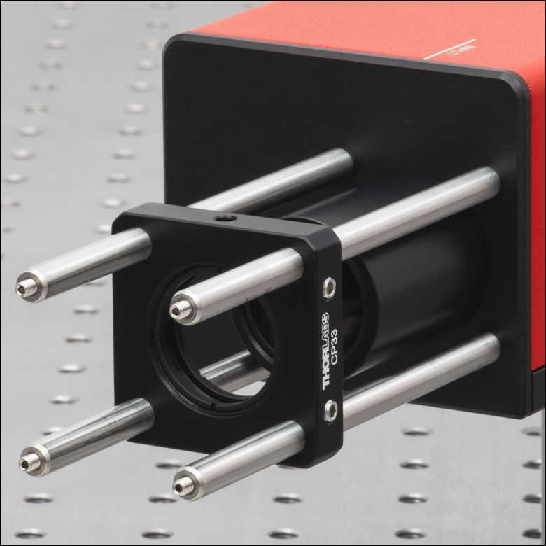 The input and output ports of the LCDR feature internal SM1 threading, which can be used to install externally SM1-threaded alignment targets or irises (not included). Both ports also have four 4-40 threaded holes for compatibility with our 30 mm cage systems. To aid in initial alignment, we recommend using cage assembly rods and our CP20D 30 mm cage system iris diaphragm, as shown in Figure 1.3.