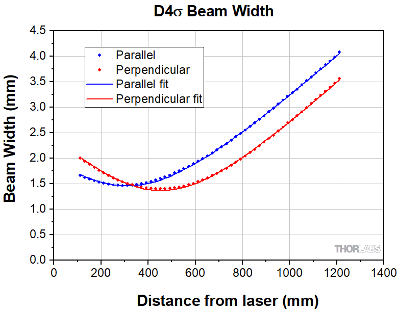 レーザの仕様書によれば、光線の水平と垂直方向における典型的なビーム発散角の半値幅(FWHM)はそれぞれ40°と60°です。 従って光が発散するにつれて、光線は楕円形になっていきます。 コリメートの過程でできるだけ光が蹴られないようにするために、どの計算においても2つの発散角のうち、大きな方の数値を使ってください(この場合は60°)。