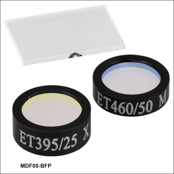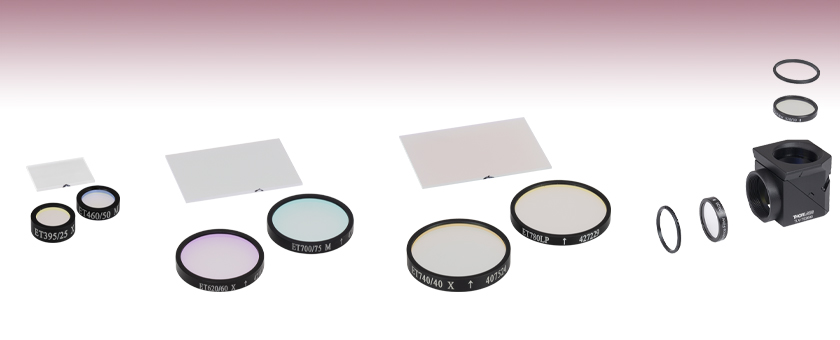 標準的な蛍光イメージングのアプリケーションでは、信号対雑音比を最大化するため、通常3種類のフィルタ(励起フィルタ1枚、吸収フィルタ1枚、ダイクロイックフィルタ1枚)が組み込まれますが、当社ではこれらのフィルタを単体でご購入いただくよりお得なセットでご用意しています。励起フィルタ、吸収フィルタ、およびダイクロイックフィルタの一部はセットでのみ販売しており、単体ではご購入いただだけない製品もございます。これらのフィルタとフィルタのセットは、当社の25 mmフィルタ用30 mmケージキューブに取り付け可能です。これらのフィルタを当社製、Olympus製、またはNikon製の蛍光顕微鏡でお使いになる場合には、ドロップイン式顕微鏡用フィルターキューブをご利用いただけます。
