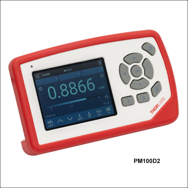 The PM100D2 and PM100D3 Optical Power and Energy Meter Consoles are the cornerstone of Thorlabs' optical power and energy meters and are the digital counterparts to the PM100A analog power meter console. The consoles (and sensors, sold separately) are ideal for use as CW and pulsed source power meters, incoherent optical source power meters, general light power meters, fiber power meters, and more. The display on the PM100Dx power meter features adjustable brightness settings and the option of using a dark, bright, or black background.