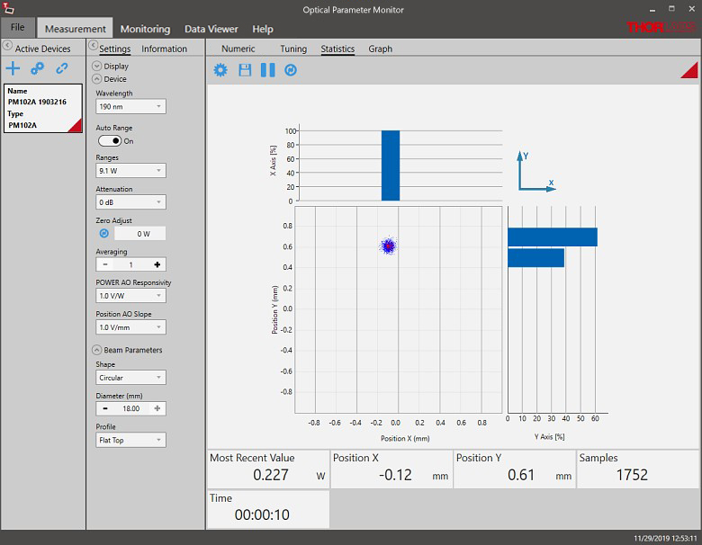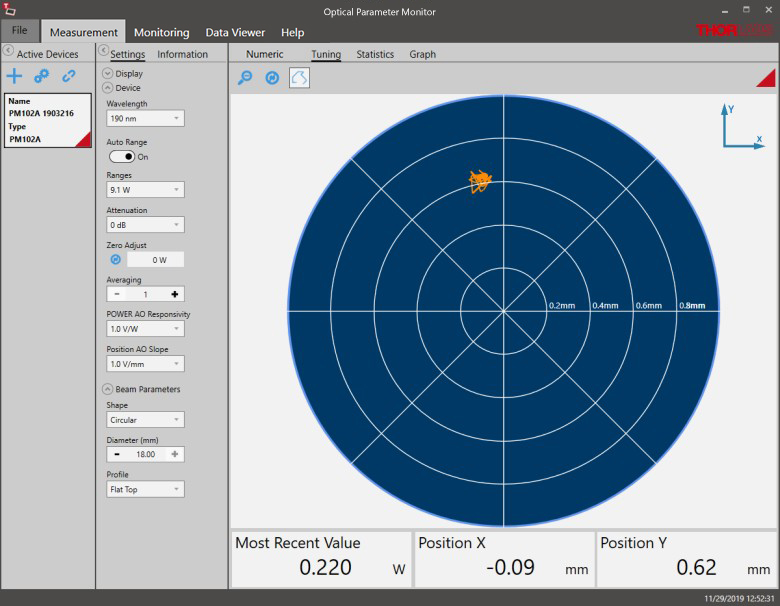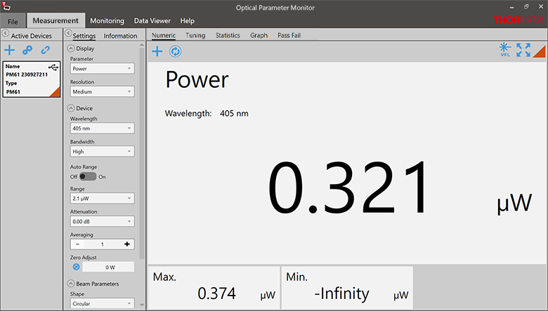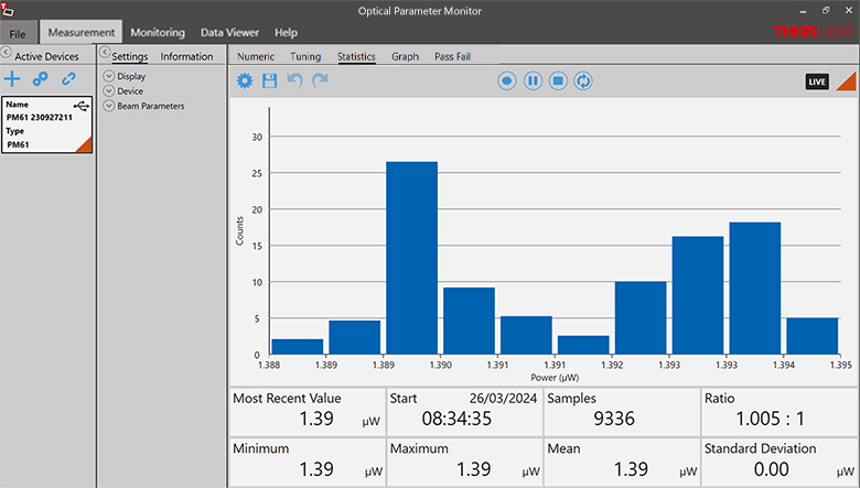 The PM100D2 console features four standard measurement screens. The first option is a numeric readout useful for standard power and energy readings, with a bar graph shown below the numerical value. The second option is a tuning needle typically seen on analog devices; however, it is optimized to run as a digital readout on the display screen, with the numerical power measurement value shown below the tuning needle. Third is a data logging feature with a line graph, which is convenient for fine-tuning CW and pulsed sources and for characterizing power changes over time. The fourth is a statistics screen that shows the descriptive statistics of the logging data, including the mean, standard deviation, maximum, minimum, median, Q1, and Q3, with a box-and-whiskers plot of the distribution also shown on this screen. The logged data is saved to the internal memory and can be opened for viewing in the device's data viewer. In each of these four measurement screens the average or peak power can be measured when used with photodiode sensors.