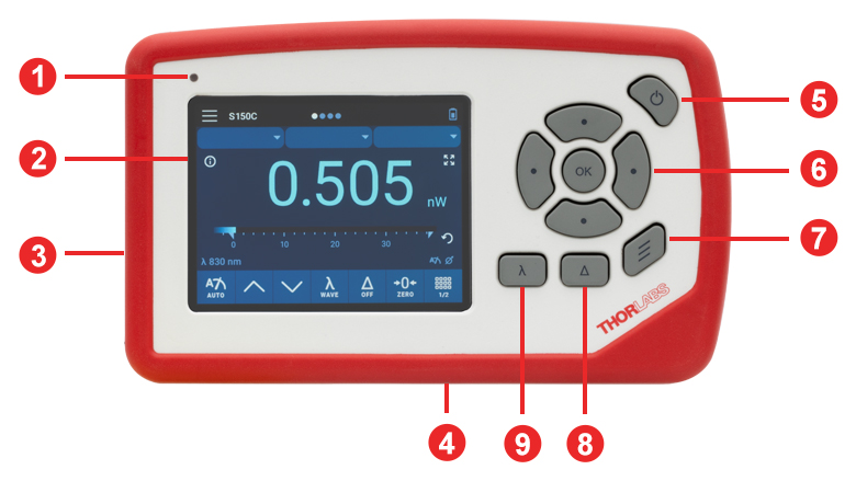 The compact housing has a large, 3.5" backlit, full color, touchscreen display with a resolution of 640 x 480 pixels and illuminated buttons, all of which make operation in dark labs easy. The device GUI offers easy data readouts with an intuitive navigation scheme. The foldable stand on the back of the device allows it to be supported on any flat surface at an angle so the screen can be seen from above. The device's USB 2.0 Type-C connector is used for power and a connection to a PC, and the PM100D3 console also features Bluetooth connectivity and an internal wireless charging coil. See the Panels tab for images and descriptions of the features on the front and back panels and the left side's recessed connector plane.