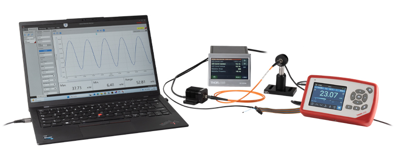 The PM100D2 and PM100D3 consoles are compatible with more than 40 photodiode, slim photodiode, integrating sphere, fiber, thermal, and pyroelectric sensors designed for use from the UV to the Mid-IR, with a bandwidth of up to 100 kHz, depending on the sensor and settings. The PM100D3 console is also compatible with our thermal position and power sensors. See the Sensor Selection tab for more information on compatible sensors, available for purchase below.