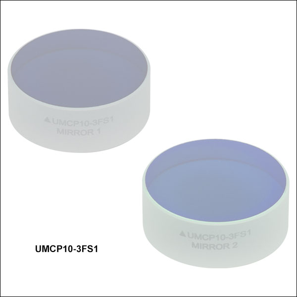 Ø12.7 mm(Ø1/2インチ)ミラーの厚さは6.35 mm、Ø25.4 mm(Ø1インチ)ミラーの厚さは9.5 mmです。マルチパスを構成するときにクリアエッジを最大化するために、UMC105-15FSは接着式ミラーマウントPOLARIS-K05C4に、UMC10-15FSは接着式キネマティックミラーマウントPOLARIS-K1C4に取り付けることをお勧めします。