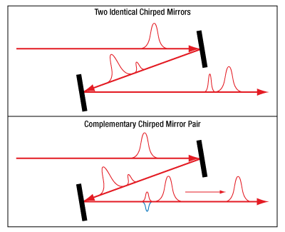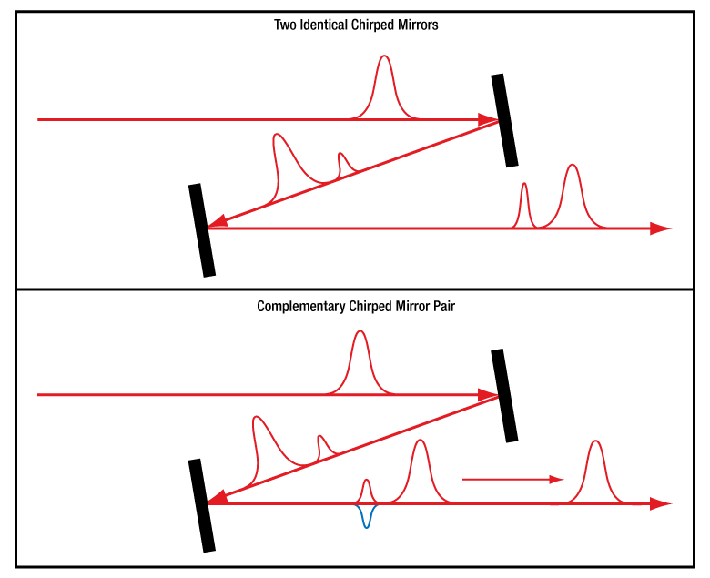 Figure 3.1は、正の群遅延分散をチャープミラーで補償する例を示しています。チャープミラーは、群遅延分散の前置補償用または後置補償用として、分散素子の前または後に配置して使用することができます。