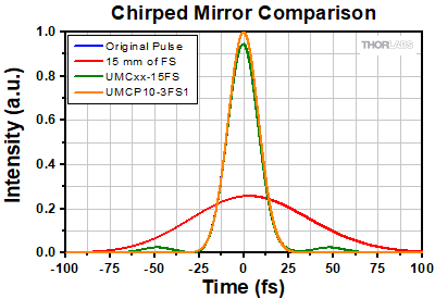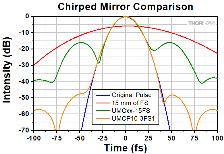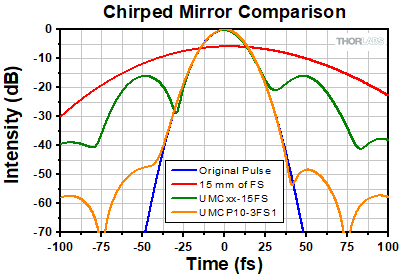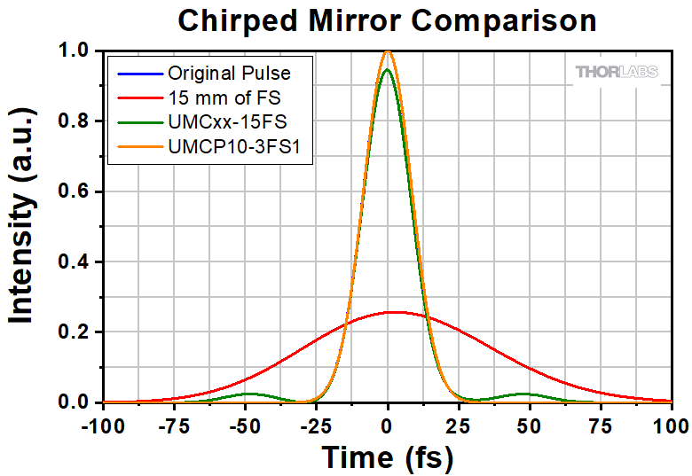 Figure 3.3 チャープミラーUMCxx-15FSと相補型チャープミラーペアUMCP10-3FS1の比較。元のパルス、15 mmの溶融石英(ビームスプリッタUFPBS10Aなど)を透過後のパルス、15 mmの溶融石英と2枚のミラーUMCxx-15FS(ミラー1枚あたり5回の反射)を透過後のパルス、15 mmの溶融石英とミラーペアUMCP10-3FS1(ペアで5回の反射)を透過後のパルスの各時間プロファイルを示しています。チャープミラーペアUMCP10-3FS1を使用すると、時間プロファイルが保持され、また衛星パルスも抑制されます。