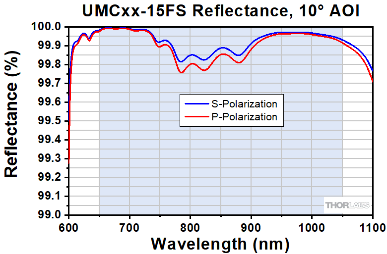 当社のチャープミラーUMC05-15FSおよびUMC10-15FSの1枚あたりの反射率は、650~1050 nmにおいて>99.5%です。このコーティングは、1.5 mmの溶融石英によって生じる仕様波長範囲内の分散を、1回の反射で補償するように設計されています。このミラー1枚で生じる平均GDDの設計値は-54 fs2です。これは、波長800 nmにおいて1.5 mmの溶融石英で生じるGDDを補償するのに適した値です。10°の入射角では、ミラーはS偏光とP偏光のどちらでも同様に機能します。またこの入射角は多重反射を必要とするコンパクトなセットアップに適しています。こちらのミラーの性能についての詳細は「仕様」タブをご覧ください。