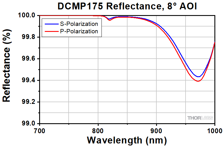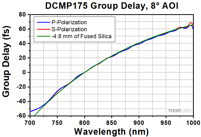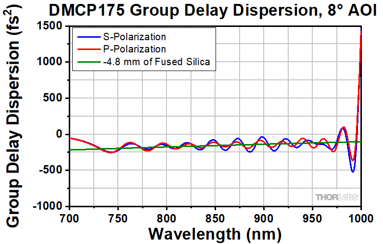 DCMP175は、波長範囲700~1000 nmにおける平均反射率>99%(ミラー1枚あたり)の2つの長方形光学素子で構成されています。一般に多光子顕微鏡は分散性の高いガラスを透過する長い光路を有しますが、こちらのミラーはそのようなセットアップに組み込むように設計されています。このミラー1枚で生じる平均GDDの設計値は-175 fs2です。これは、波長800 nmにおいて4.8 mmの溶融石英で生じるGDDを補償するのに適した値です。8°の入射角では、ミラーはS偏光とP偏光のどちらでも同様に機能します。またこの入射角は多重反射を必要とするコンパクトなセットアップに適しています。