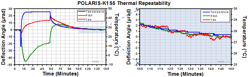 • 高さ50.8 mmのビームに対して、クランプフォークPOLARIS-CA1で固定されたステンレススチール製Ø1インチポスト上に取付けられPolarisマウントを用いた場合、12.5 °Cの温度サイクル試験後のビーム位置は、初期位置の1 µrad以内に復帰します。詳細は「試験データ」タブをご参照ください。