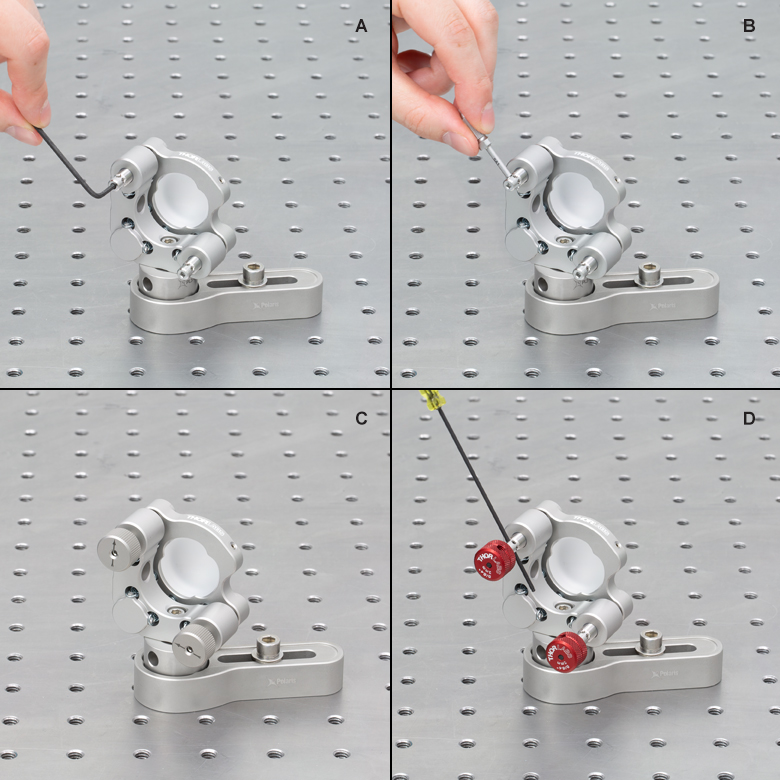 The Polaris® Removable Knobs for 1/4"-100 Adjusters allows the user to adjust a Polaris kinematic mirror mount by hand. The knobs can be used with select Polaris mounts, listed in Table 613A. Note that when the knobs are used with any of these mounts, they will block the side through holes on the adjuster. The adjuster screw's 5/64" (2 mm) hex socket is still usable when the knobs are attached.