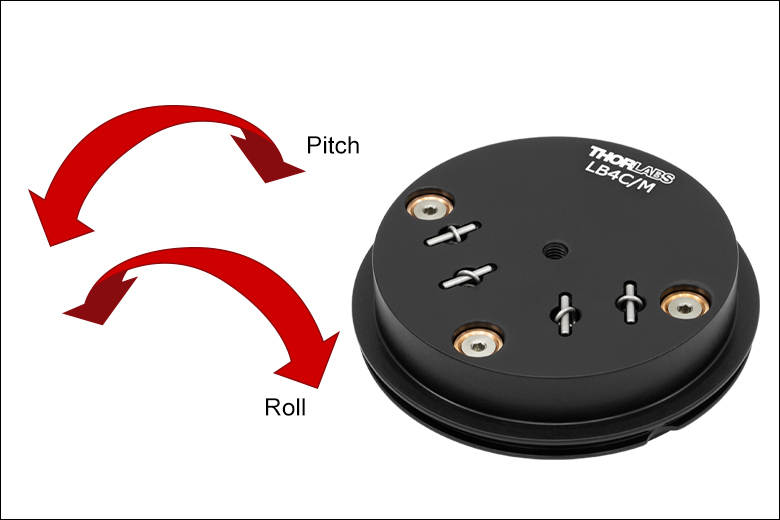 プラットフォームLB3C/Mは固定式で、手動による粗動回転位置決めしかできませんが、プラットフォームLB4C/Mでは、回転位置決めの他に、3つのアジャスタによりピッチ、ロールおよびZ軸方向(6.35 mm)の移動の手動調整も可能です。LB4C/Mには、キネマティック調整用に1/4"‑80アジャスタが3つと2 mm六角インチが1つ付いています。プラットフォームの底部のM4のタップ穴により Ø12 mm~Ø12.7 mm(Ø1/2インチ)ポスト上に取り付けることもできます。