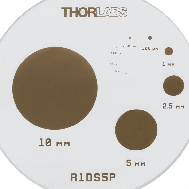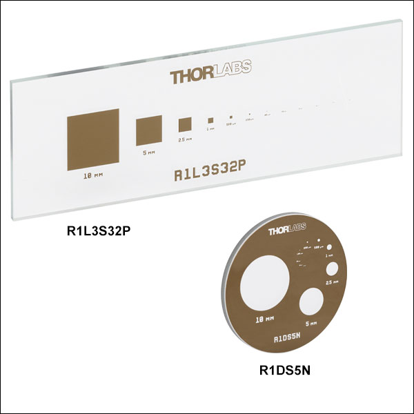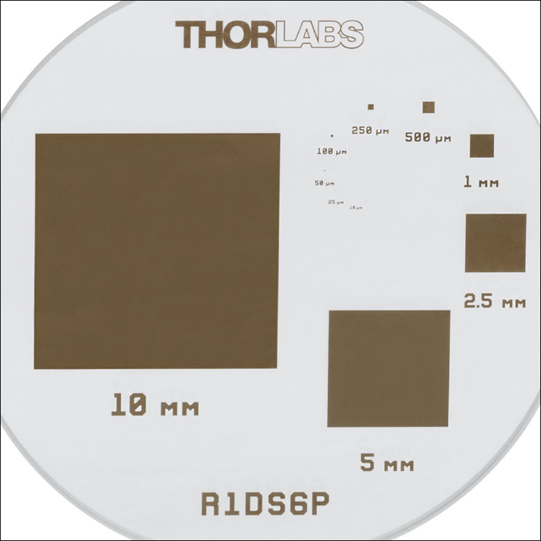 | R1DS5P | Circle | 10, 25, 50, 100, 250, 500, 1000, 2500, 5000, 10 000 µm | Low-Reflectivity Chrome | Clear | Ø1.00" x 0.06" (Ø25.4 mm x 1.5 mm) | ||