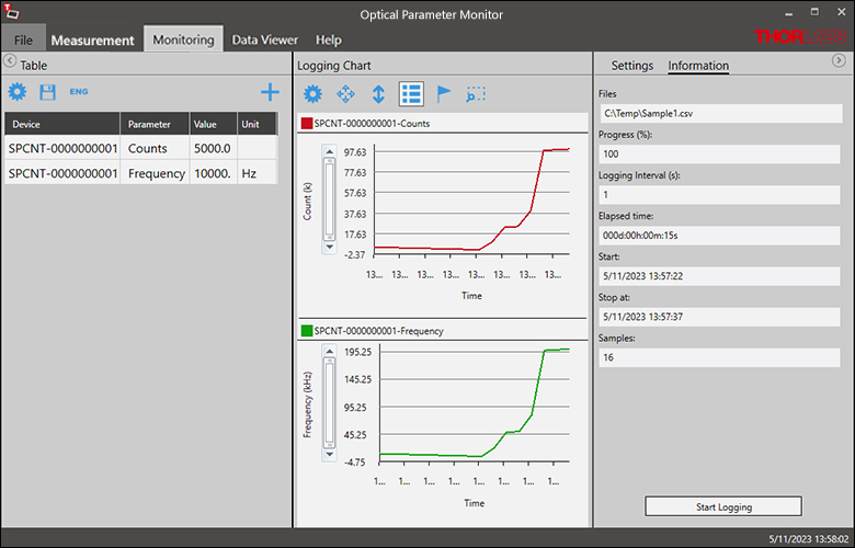 - ソフトウェアOptical Parameter Monitor を使用して測定値のモニタおよび測定結果の保存が可能