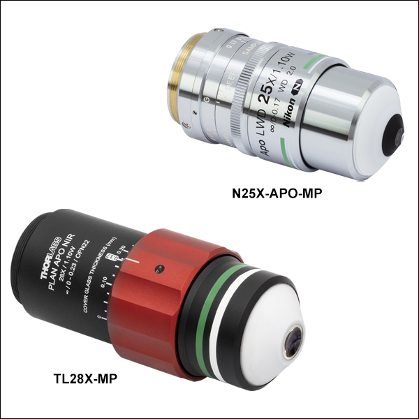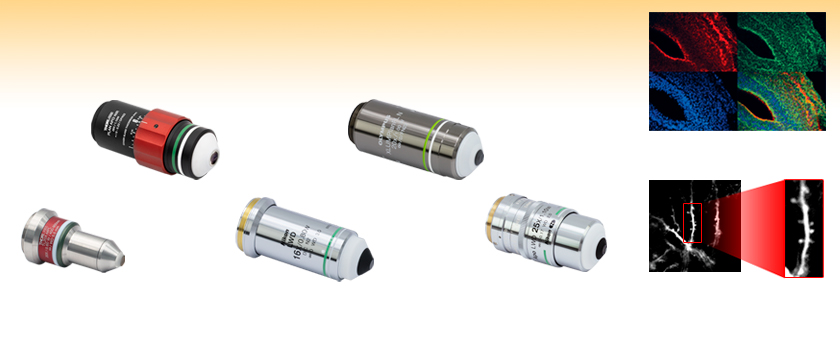 これらのアポクロマート水浸(Water Dipping)対物レンズは多光子顕微鏡用に設計されており、その倍率は25倍または28倍です。これらがアポクロマートレンズと呼ばれるのは、近赤外(NIR)域を含む仕様波長範囲において優れた色収差補正を実現していることによります。