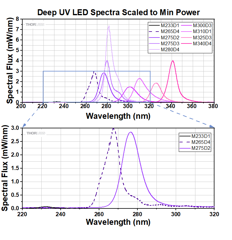 LEDの実際の出力スペクトルや合計出力値は、製造バラつきや温度や電流などの動作パラメータの違いによって変動します。 適切なLEDをお選びいただくために出力の典型値と最低値を明記しました。 メタルコアPCB LEDは、最大電流において少なくても記載されている最少パワーを出力します。 異なる公称波長において比較するため、下記のプロットではスペクトルは各LEDの最少出力値を表示しています。 このデータは代表値です。すべてのマウント済みLEDのスペクトルデータをまとめたエクセルファイル(規格化データおよびスケーリングデータ)はグラフ下のリンクからダウンロードいただけます。