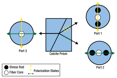 Figure 1.1のように、当社のシングルモードPBCでは、1本のシングルモードファイバと2本の偏波保持ファイバが使用されます。シングルモードファイバ(ポート3)に入射された光は、方解石プリズムにより直交した直線偏光に分けられます。プリズムから出射した2つのビームの偏光方向は、各PMファイバのスロー軸に合っています(ポート1とポート2)。