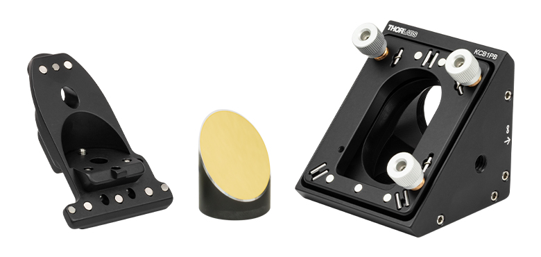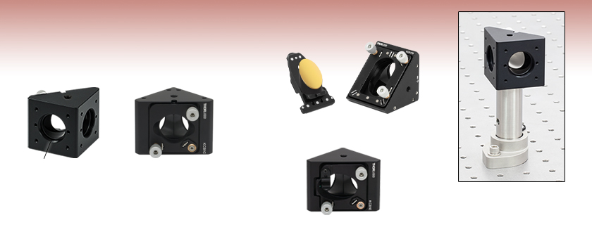 直角マウントKCB1P5/MおよびKCB1PB/Mに、それぞれØ12.7 mm(Ø1/2インチ)およびØ25.4 mm(Ø1インチ)軸外放物面(OAP)ミラーを取り付けると、ミラー面は45°の角度にセットされ、さらにあおり調整(ピッチ&ヨー)が可能になります。入出力ポートにはSM1ネジが付いており、また30 mmケージシステムに対応する深さ6.4 mmのネジ切りのない穴が4つ付いています。ケージロッドは8個の止めネジ(セットスクリュ)で固定しますが、その際は2 mm六角レンチまたはボール(六角)ドライバを使用します。この設計により、ERシリーズロッドアダプタERSCBを使用せずに、複数の30 mmケージ用コンポーネントを取り付けられます。あおり調整(ピッチ&ヨー)用のプレートは3つの100 TPIアジャスタネジで操作できますが、その角度分解能は1回転あたり7.6 mradです。アジャスタに付いているノブは取り外すことができます。光学面はマウントのほぼ中心に配置されるように設計されていますが、3番目のアジャスタを使用すると光学面の位置を光軸に沿って微調整できます。
