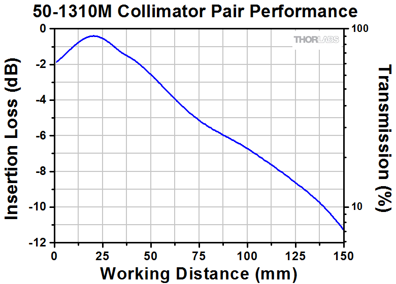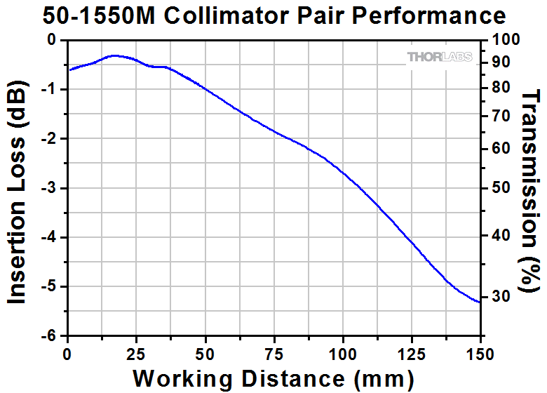 Table G1.1とG2.1の「Pair Performance」欄のアイコンをクリックしていただくと、各コリメーターペア間の距離と結合効率の関係を表した測定デーを見ることができます。 実際には、任意の2個のコリメータにおいて、固体差により、適切な作動距離は若干異なります。 ランダムに抽出されたコリメータの組み合わせにより収集されたデータはTable G1.1とG2.1でご参照いただけます。 最良の結合状態にするには、アダプタSM05PT(下記参照)に組み込んだコリメータをPOLARIS-K05T6などのキネマティック式調整マウントに取り付け、最終的なアライメント調整することをお勧めします。ビーム径、ビーム距離やペアでの挿入損失などの仕様値は、任意のコリメーターペアにおいて、作動距離15 ± 5 mmで保証されている数値です。