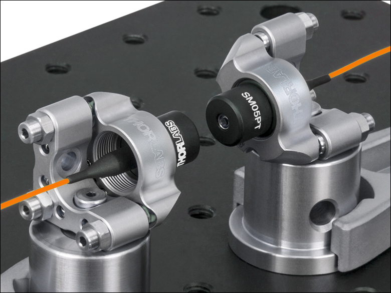 GRINレンズコリメータを使用して自由空間光をファイバに入力する場合、結合効率を上げるためには精密なアライメントが必要です。 チップ&チルトキネマティックマウントならびにレンズチューブアダプタを調整機能付きXYZステージに組み合わせるか(例えば当社のPOLARIS-K05T6、下記に掲載のSM05PTとMT3/Mの組合せ)、または当社の6軸キネマティックマウントとレンズチューブアダプタ(K6XSと下記に掲載のSM1PT)を組み合わせることをお勧めします。