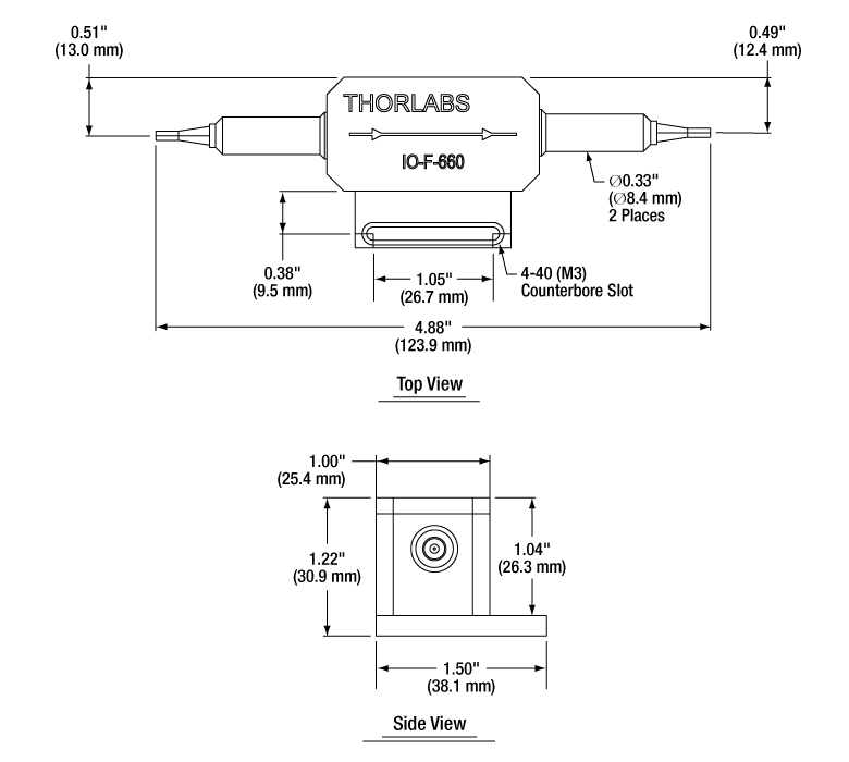 波長633 nm以下でご利用の場合は、フリースペース型アイソレータをFiberBenchと組み合わせて、ファイバ結合コンポーネントを構成していただくことをお勧めしています。FiberBenchシステムは、良好な結合効率でフリースペース型光学素子を光ファイバーシステムとしてお使いいただけるように設計された小型ベンチタイプのモジュールです。ご要望に応じて、下の写真のように、アイソレータを2個の位置決めピンが付いた光学マウントに取り付けた状態でお届けすることも可能です。
