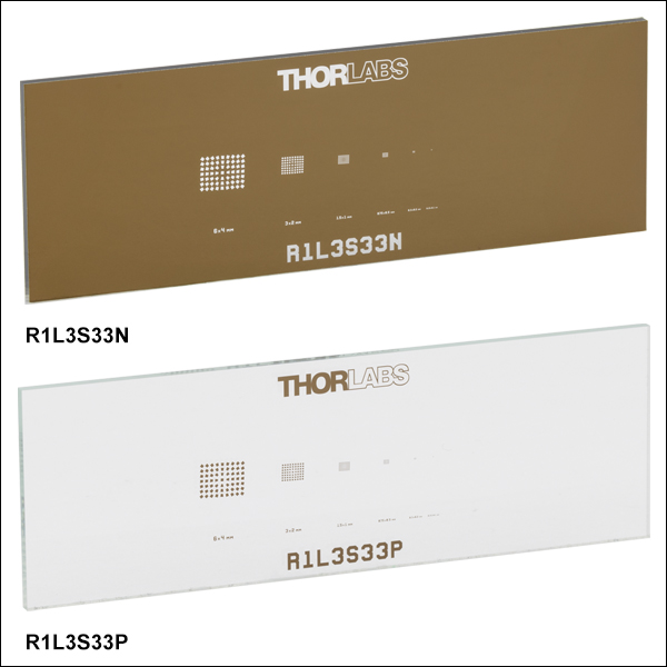 Thorlabs offers two lens grid slides that are designed to measure the edge acuity of an imaging system using its MTF50 value, the spatial frequency at which the MTF falls to 50% of its maximum, which corresponds to the perceived sharpness of edges. The slides offer target grids of descending sizes of 6 mm x 4 mm, 3 mm x 2 mm, 1.5 mm x 1 mm, 0.75 mm x 0.5 mm, 0.3 mm x 0.2 mm, and 0.15 mm x 0.1 mm that can be used to characterize imaging systems. The R1L3S33N negative slide is fabricated from the deposition of a dark low-reflectivity chrome pattern on a 3.00" x 1.00" x 0.06" (76.3 mm x 25.4 mm x 1.5 mm) soda lime glass substrate, while the R1L3S33P positive slide consists of the same low-reflectivity chrome pattern plated onto a clear substrate.
