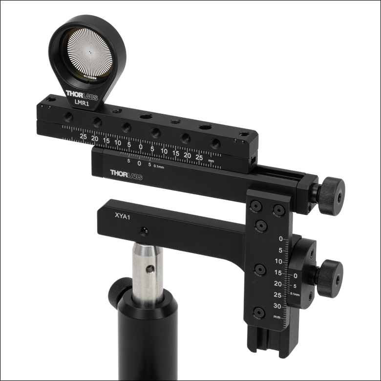 To mount our rectangular targets, Thorlabs offers the XYF1(/M) Test Target Positioning Mount (see Figure 1.2), while for our circular targets, Thorlabs recommends the XYA1(/M) Test Target Positioning Mount (see Figure 1.1). These mounts are capable of translating a target over a 50 mm (1.97") x 30 mm (1.18") area and secure a target using nylon-tipped setscrews. The mounts contain five 8-32 (M4) taps for six post-mountable orientations.