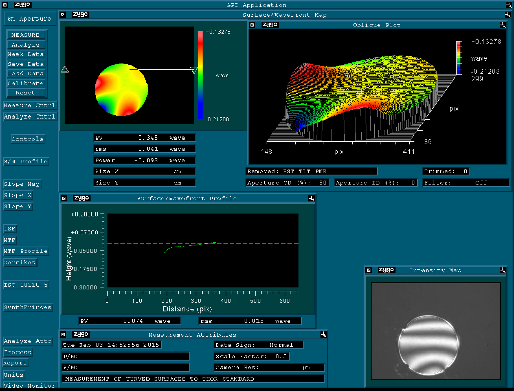 Table 2.3で示されているように、波面歪みのPV(peak-to-valley)は、0.4波長未満でした。 ただし、Figure 2.1の応力図とFigure 2.4、2.5、2.6、2.7のZygo製干渉計のスクリーンショットで示されているように、この歪みの大部分はタブと止めネジの付いている光学素子のエッジ部分に留まっており、ミラーの中心とクリアエッジ部分における歪みはわずかです。