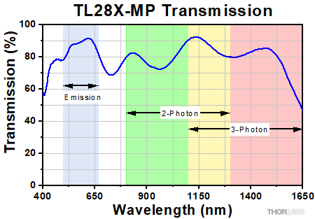 スーパーアポクロマート対物レンズTL10X-2Pおよび可視(VIS)域強化型プランアポクロマート(APO VIS+)対物レンズTL15X-2PPは、当社の他の対物レンズと同様に、可視域における軸上色収差を回折限界性能まで補正し、さらに1300 nmまで優れた透過特性を有しています。そのため、これらの対物レンズは多光子イメージング用に適しています(詳細は「グラフ」タブをご覧ください)。プランアポクロマート対物レンズTL28X-MPは近赤外(NIR)域用に最適化されており、900~1650 nmで回折限界性能が得られます。こちらも3光子励起を含む多光子顕微鏡にご使用いただけます。対物レンズの分類については「対物レンズのチュートリアル」タブをご覧ください。