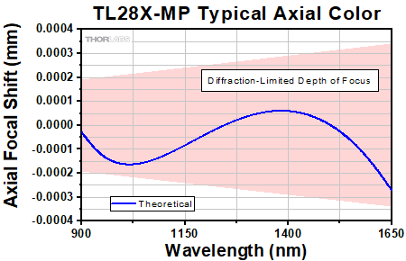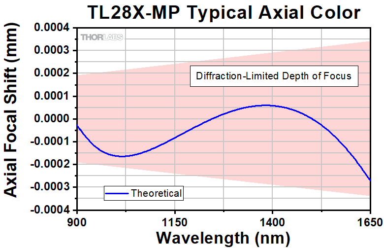 このAxial Colorは、倍率1倍の顕微鏡用スーパーアポクロマート対物レンズの、動作波長範囲における像面のシフト量を表しています。ピンクの網掛け部分は回折限界性能を表しています。