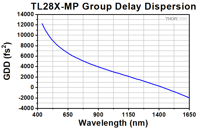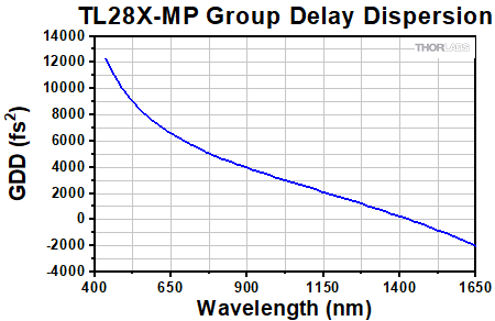 群遅延分散(GDD)は、光路を通過するときに超短パルスレーザのパルス幅がどの程度広がるかを表しています。上のグラフは対物レンズTL10X-2Pの群遅延分散のシミュレーション結果を示しています。