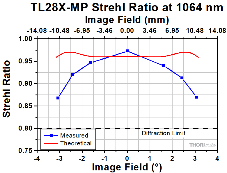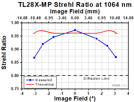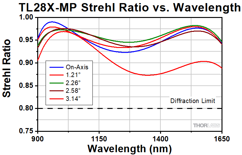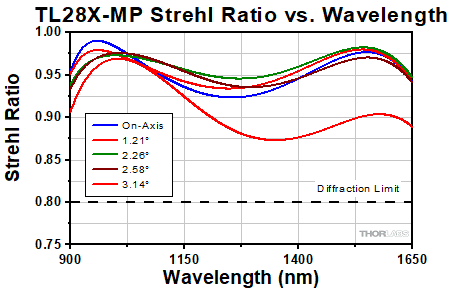 このグラフは対物レンズTL1X-SAPの動作波長全域におけるストレールレシオを示しています。
