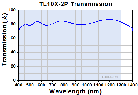 対物レンズTL10X-2Pの透過率。青い網掛け部分は、ARコーティングの波長範囲です。